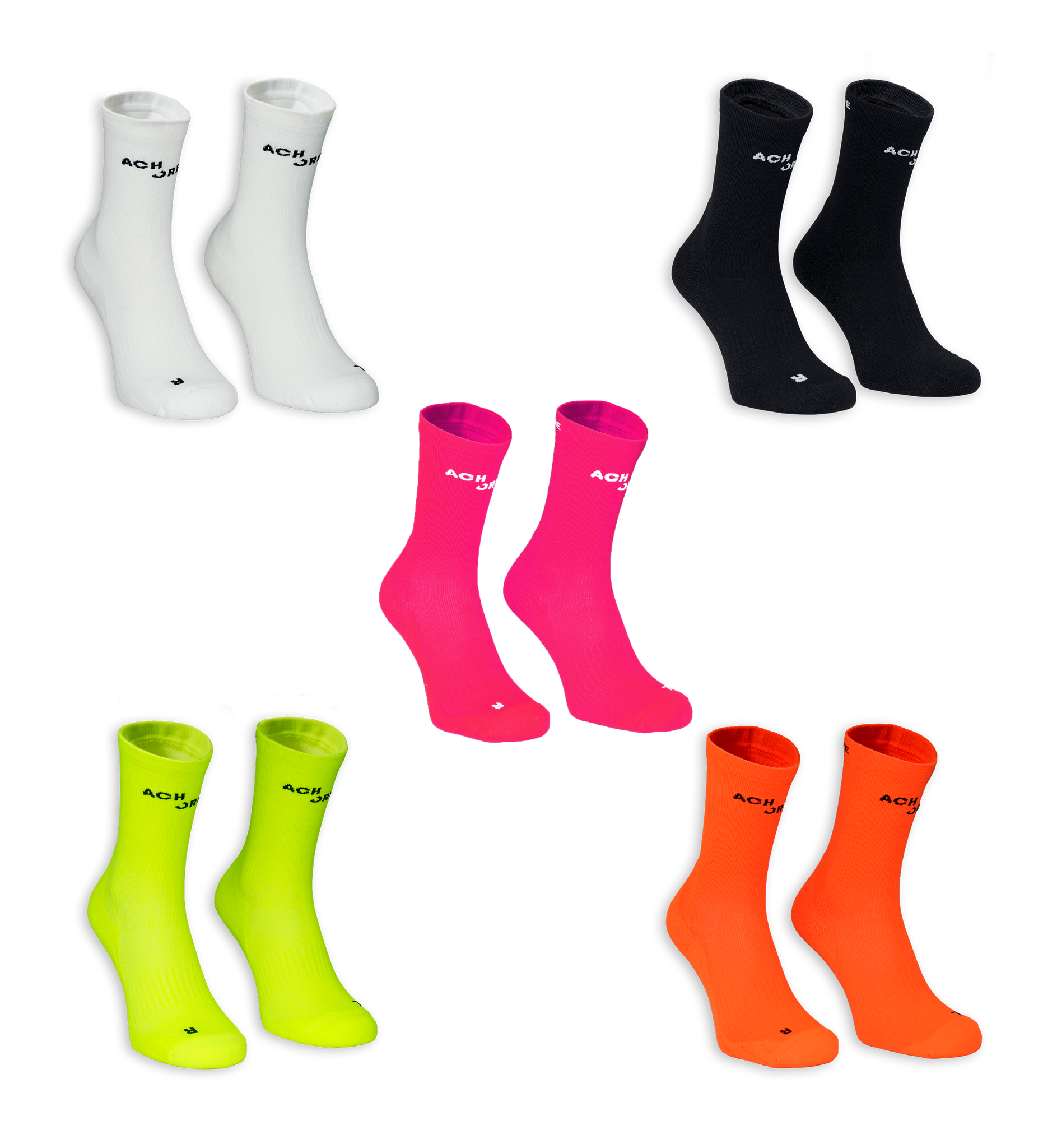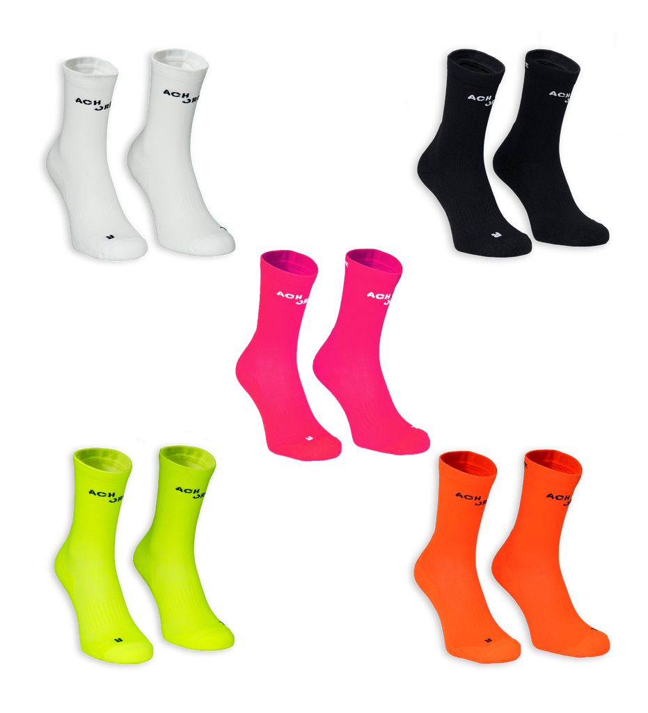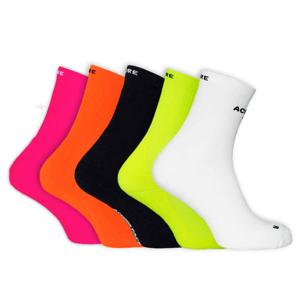 Kurze Kompressionssocken im 5er Pack: Weiß, Schwarz, Gelb, Orange und Pink. Durch die ergonomische Passform und das atmungsaktive Material sind die ACHORE Pace Socks die perfekten Sportsocken für intensive Trainingseinheiten und Wettkämpfe. Die integrierte Kompression sorgt für eine tiefensensorische Aktivierung der Hautrezeptoren und hilft deine Gelenke zu stabilisieren.
